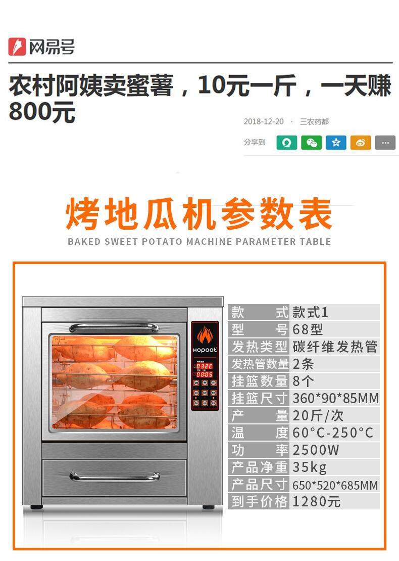 3、操作簡便:最新烤地瓜機的設計人性化,操作非常簡單,只需將地瓜放入機器,設置好烤制模式和時間,便可輕松完成烤制,無需看管。